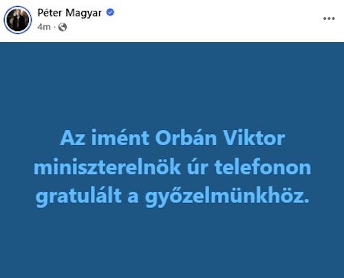 Tisza Party leader Péter Magyar said in a post on Facebook that Prime Minister Viktor Orbán had called him and congratulated him on his election victory.