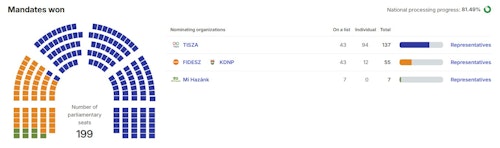According to the National Election Commission, with 53% of the votes counted, Tisza is leading and set to take at least 136 seats in the 199-seat Parliament.